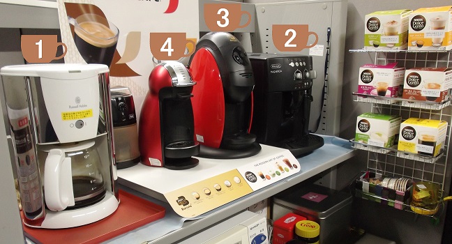 | 弊社の給茶コーナーで一番新しいマシンです。 専用のカプセルを使用して、コーヒーのみならずココアや宇治抹茶ラテも淹れることができます。 カプセルは有料ですが、ついつい飲んでしまう、と評判です。 |